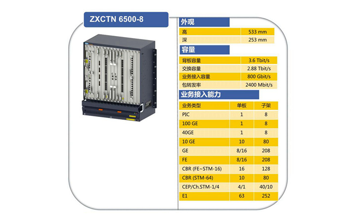 ZXCTN 6500-8采用開放式的技術平臺,兼容傳統的傳輸和數據網絡。